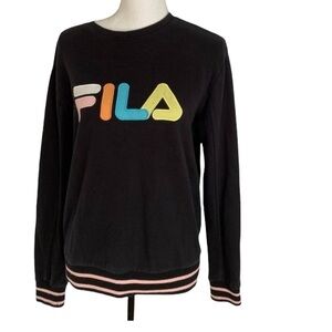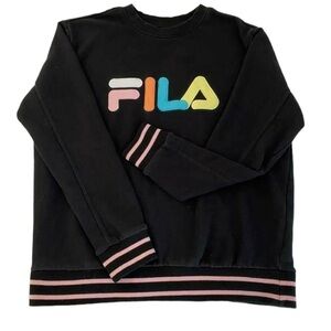 Vintage FILA Black Sweatshirt with multicolored embroidered lettering Ribbed cuffs & hem with matching double pink stripe Crew Neckline 23” Pit to Pit 24” Length 19” Sleeves
