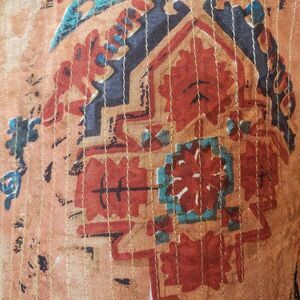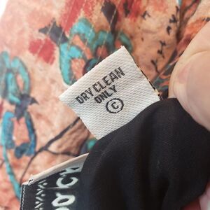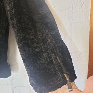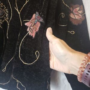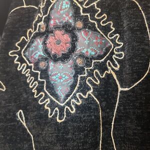 One side is a black chenille type fabric with floral appliques and embroidery.