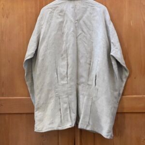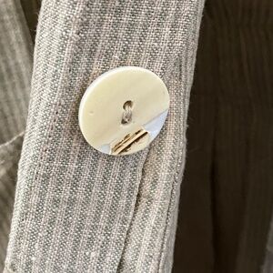 Flax by Angelheart (pre-affirmations, i.e., before 1998) Placket Jacket in Oatmeal Stripe mid-weight 100% linen. Oatmeal Strip is natural linen and a light khaki green striped fabric (see label photo). This jacket was from the Premier Flax line, spring 1997. Very good condition: no stains, tears, just some of the bone or mother of pearl buttons have chips. Extra button still sewn to inside side seam). The fit is very oversized: measured flat, P2P is 29 inches.