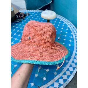 VINTAGE FLORA BELLA 100% RAFFIA ADJUSTABLE STRAW HAT CORAL TURQUOISE