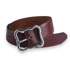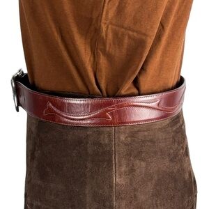 VINTAGE FLORAL ETCHED BUCKLE BROWN TOOLED LEATHER BELT WESTERN BOHO RODEO HIPPIE
