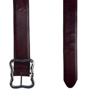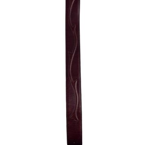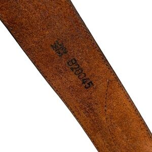 DETAIL: TOOLED THORN LEATHER. 5 HOLE ADJUSTMENT. WAVY FLORAL ETCHED BUCKLE.