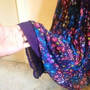 Vintage floral tiered skirt full and flowing purple with blue, pink, yellow, turquoise flowers elasticated waist 3 tiers ankle \floor length full length purple lining