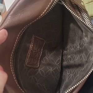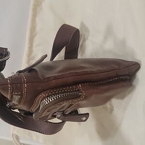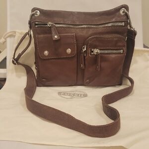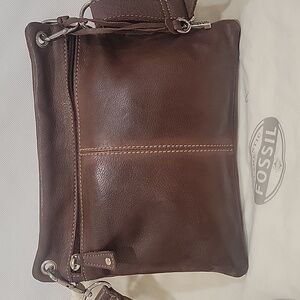 Vintage Fossil brown leather crossbody handbag with dust cover. The bag is in great condition. The key handbag is attached. There are 2 zippered compartments, one on the back and one on the front. There are also 2 smaller pockets on the front. Please see all pictures.