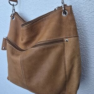 Stylish and versatile tan leather shoulder bag, perfect for everyday use. Please see all pics. Some markings on front of bag inside clean.