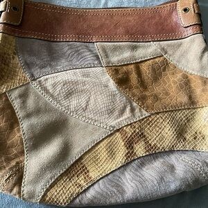 Gorgeous crossbody, suede patchwork bag, zip top closure, inside has two open pockets and one zip compartment, adjustable strap, great condition