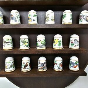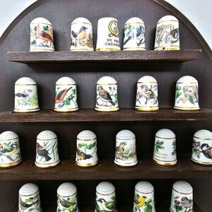 VINTAGE FRANKLIN PORCELAIN THIMBLE BIRDS LOT OF 25 W/ WOODEN DISPLAY 1979