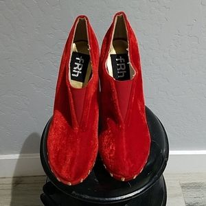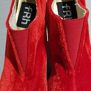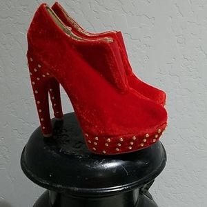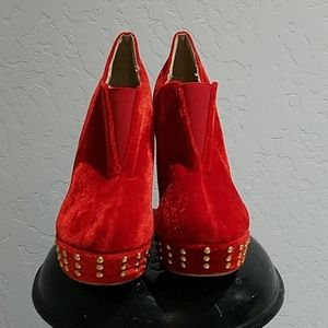 If you love to pop with character then these frh red velvet gold studded platform heels are for you!! size 6 and 1/2 all studs present super cool and sexy, velvet pull up Sock Style, one scuff on back of heel I tried to get it in the last pic, nothing to stop you from rocking these up in the club 🥂