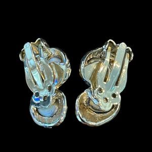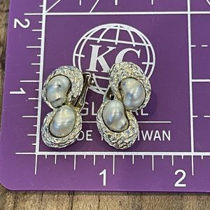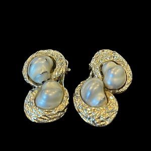 Vintage faux pearl clip on earrings set in stamped gold tone bezel set. Slight wear to the faux pearls. Please see photos for size and details.