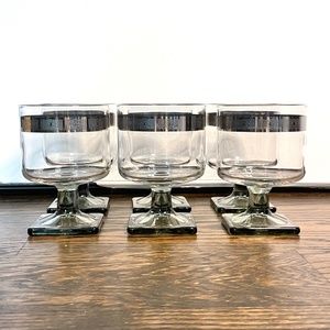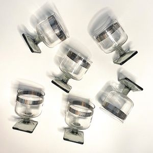 This nostalgic set is Mid Century Modern GLAMOUR with the smoke short stem, square base, and silver band with etched butterfly. This set would be so impressive to show off!! Perfect for sipping champagne or enjoying your favorite craft cocktail and to serve up an elegant dessert! 1960's gorgeous perfection!