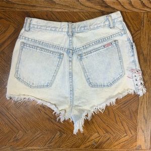 VINTAGE Authentic Filippo Totti / Filippo Toti retro acid light wash denim, high waist frayed raw hems jeans shorts. Side ties. Zipper fly button closure.