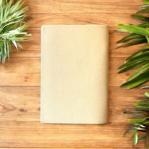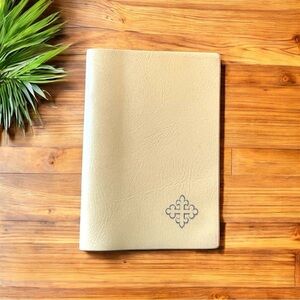 • Unique vintage Finnish scout achievement book with a beige leatherette cover and cross emblem.