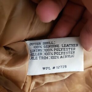 Materials (per tag): Outer shell 100% genuine leather; lining 100% polyester; filler 100% polyester; pile trim 100% acrylic; WPL 12739.