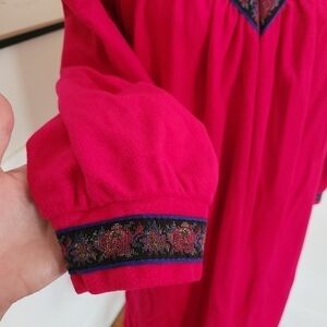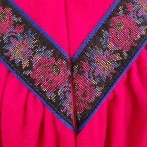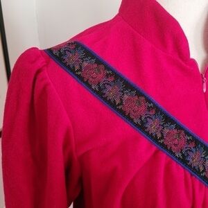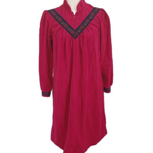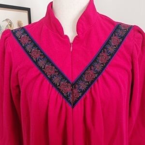 Vintage Partners Fleece House Dress Coat Fuschia Pink Fleece Material (First photo is closet to actual color) Super Soft, Warm and Cozy Perfect for the Season Floral Tapestry Ribbon Detail on Chest and Sleeve cuffs Long Sleeves Half Zip Closure Size Small (Oversized) Approximate Flat Measurements Pit to Pit 19" Length 40" Great Vintage Condition Tags- Fall, Autumn, Winter, Christmas, Pajamas, Dressing Gown, Nightgown, Sleep, Lounge, Coffee, Retro, Housewife, Granny, Robe, Maximalist, Bold, Eclectic