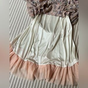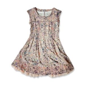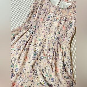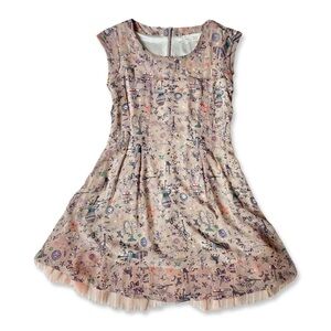Flattering and absolutely gorgeous, unique vintage dress with a totally random yet beautiful print with hints of purple, green, orange, and white. The color of the actual dress is like a mix of a light pink/mauve/tan.