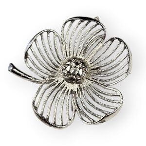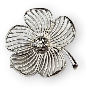 Mod silver tone flower brooch with slightly curved petals and textured, open work stripes