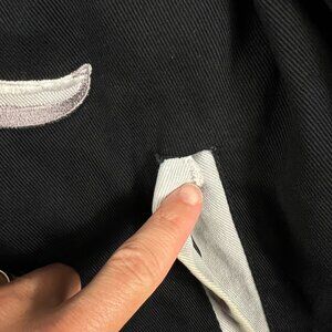 Condition: Shows wear with specific flaws. Noticeable discoloration/yellowing on the off-white pocket welts and on the back collar. Loose stitching at the edge of one pocket (see close-up). General light wear and faint surface fading from age/use. Lining intact; snaps function properly. No major holes or tears observed beyond the noted issues. Please see photos for exact condition.
