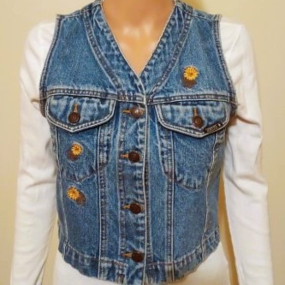DESCRIPTION: MEDIUM WASH JEAN VEST WITH FRONT BUTTON CLOSURE EMBROIDERED WITH SUNFLOWERS