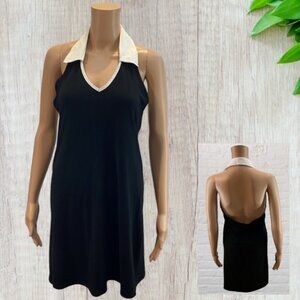This stunning vintage black sun dress is the perfect addition to your summer wardrobe! This knee-length dress features a crisp white collar and a v-neck outlined in white, giving it a chic and stylish look. The backless design adds a touch of allure, while the lightweight fabric makes it perfect for sunny days. Pair it with sandals for a casual and comfortable look that will keep you cool all season long.