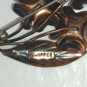 Delicate copper floral pin measuring about 2 1/2" long. There is a small plaque on the back marked "COPPER" but no actual maker's mark.