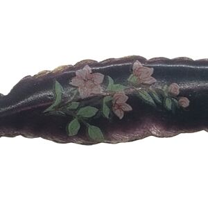 Lovely little goldtoned pin depicting a feather with glazed purple enameled front and handpainted flowers with ladybug portrait. Pin measures 2 inches long and 1/2 inch tall. Excellent condition