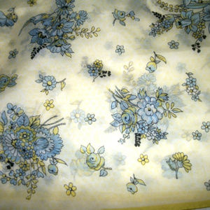 White with pale yellow polka dots and pretty blue flowers