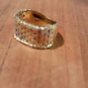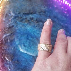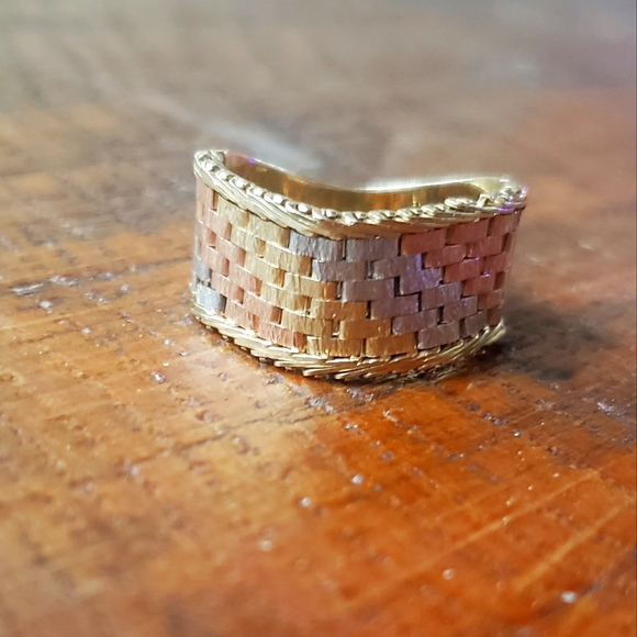 1930-40$ mesh / chainlink tricolor gold ring EXCELLENT condition. extremely rare to find this style in this condition. I was only able to locate 2 other pieces ( possibly same set) on et$y. I'm 3rd owner. worn 1x years ago. 2nd owner never wore it. It actually belonged to her mother who received it as a " just because I love you" gift . ๐๐