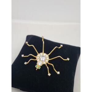 VINTAGE GOLD TONE AND WHITE RHINESTONES 3D SPIDER BROOCH PIN 80S HALLOWEEN