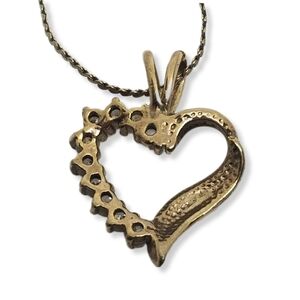 Lovely vintage heart pendant necklace made of goldplated brass. Heart has an open design and is set with glass crystals. Pendant is on a serpentine style chain that measures 18 inches in length. Great condition.