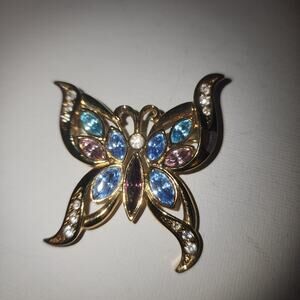 VINTAGE GOLDTONE BLUE RHINESTONE BUTTERFLY BROOCH PIN