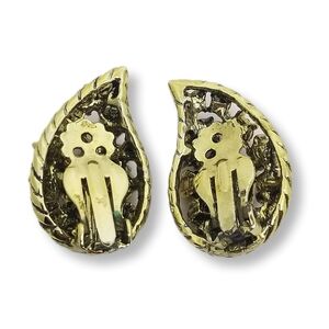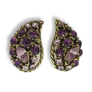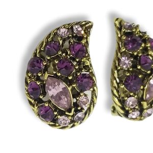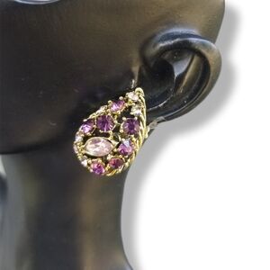 Beautiful vintage high quality statement earrings. Earrings are goldtone with rope design detail along outside edge of earrings and set with pink and purple Austrian crystals. Earrings measure 1-1/4 inches tall and 3/4 inch wide. Earrings have clip on style backs and are in good condition with one little missing crystal in one of the earrings.