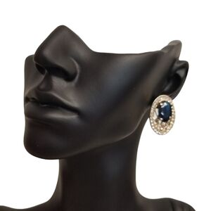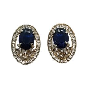 Beautiful vintage goldtoned oval shaped earrings with a large blue faceted austrian crystal and small white Austrian crystals around large stone and around outside edge of earrings.