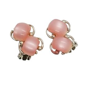 Beautiful vintage thermoset earrings, goldtoned with pink pearlescent lucite cabachons. Earrings measure 1-1/8 inches tall and 1-1/8 inches wide with clip on style backs. Earrings are in great condition
