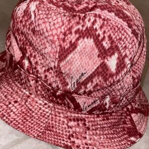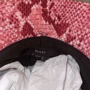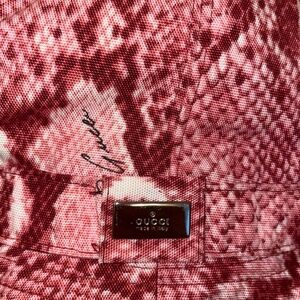 Vintage Rare Gucci Bucket Hat from yr 2000. Barely worn.clean lining. Excellent shape. Gucci metal emblem on side and Gucci signature. Pink/ burgundy print.