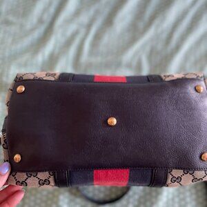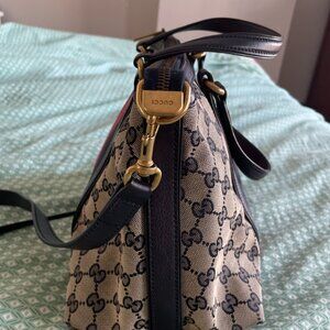 VINTAGE GUCCI WITH NAVY/RED WEB STRIPE CROSSBODY BAG WITH FRINGE TASSEL CHARM. CLEAN INTERIOR, ONE ZIP INTERIOR POCKET, ZIP TOP CLOSE