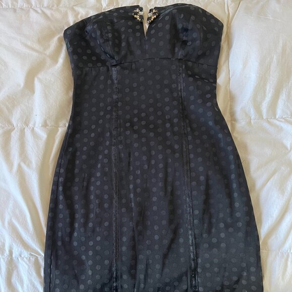 Adorable vintage mini black dress from the 90's! Size XS, No sleeves, and reaches mid/high thigh. The jewel top center can be clasped and unclasped. The front has two corset-like ridges down the length of the dress. Back has working clasp and zipper. The bottom of the back of the dress has two adorable little slits topped with bows that show the inside lace lining of the dress. No pulls, tears, or stains. Comes from a smoke-free and pet-free home.