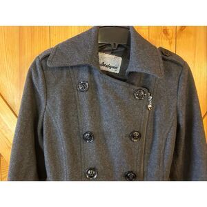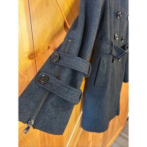 GUESS Women’s Lined Wool Blend Black Double Breasted Belted Full Zip Dress Coat. Has a double button tab with zipper cuffs and ruffled rear hem. Brand tag has wear. Size Medium (5477) Measurements: Pit to Pit 18” Length 35.5”
