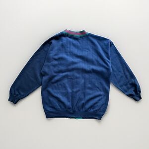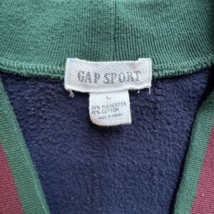 This 90s vintage Gap cardigan for men in size large is a timeless staple for your fall closet. The navy blue cardigan sweater features two-tone green and maroon stripe accent along the collar, embroidered logo on the chest pocket and snap closure. The long sleeve V-neck sweater is made of a polyester and cotton fleece fabric, suitable for casual occasions and all seasons. Featuring a tennis preppy crest design from the 90s, this cardigan exudes a timeless preppy style that is both comfortable and stylish for everyday wear.