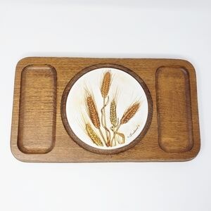 True vintage 70s Japanese piece. Goodwood wooden board with ceramic inlay with wheat design. Rubber feet on bottom prevent it from moving when served. Perfect cheeseboard for your next party!