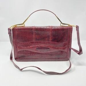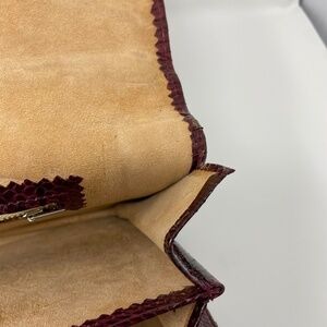 This bag looks brand new. Skin is in excellent condition. A beautiful wine color snakeskin with suede interior. Has a detachable crossbody/shoulder strap.