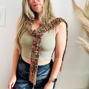 VINTAGE Gold Blue Tassel Texture Knit Yarn Multi Red Strand Scarf Cloth Bib Wrap