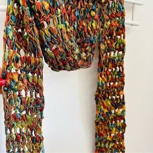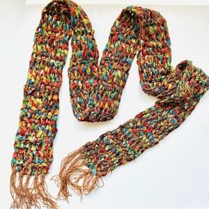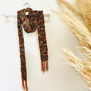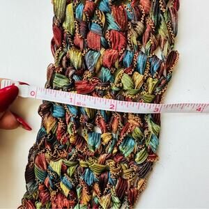 VINTAGE Gold Blue Tassel Texture Knit Yarn Multi Red Strand Scarf Cloth Bib Wrap