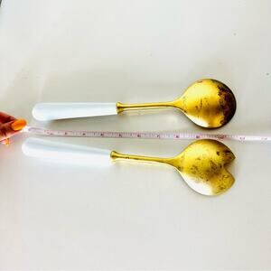 VINTAGE Gold Brass White Enamel Handle Salad Spoon Tosser Serving Utensil Set
