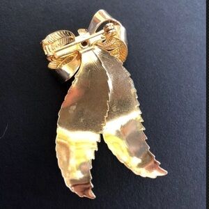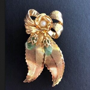 VINTAGE Gold Plated Bow Brooch Jade Stone Pearl