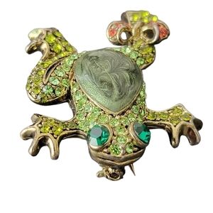 VINTAGE Gold Plated Rhinestone Green Frog Brooch