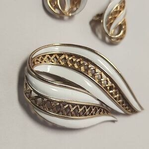 VINTAGE Gold Tone With White Brooch and Clip On Earrings Set
