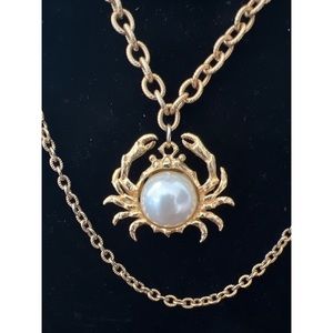 Nautical Gold Tone Two Strand Faux Pearl Belly Crab Necklace. Preloved in good condition. There is yellowing on the back side of the crab as shown in photo which isn’t noticeable when wearing necklace.