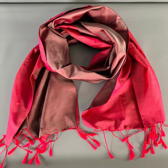 VINTAGE scarf in an iridescent grey and pink woven fabric featuring a reversible style, and fringe details.