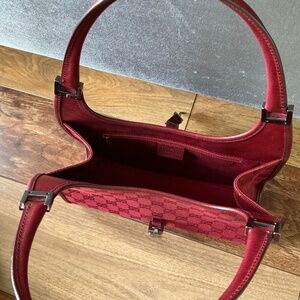 Red canvas and leather Gucci handbag. Comes with dust bag. Please see photos for serial number. Pristine condition.