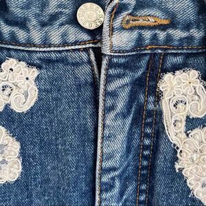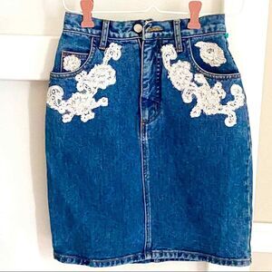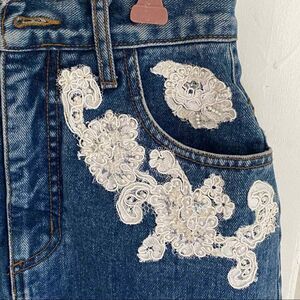 VINTAGE Guess High Waisted Short Denim Skirt (27) 90's Beaded & Lace Accents